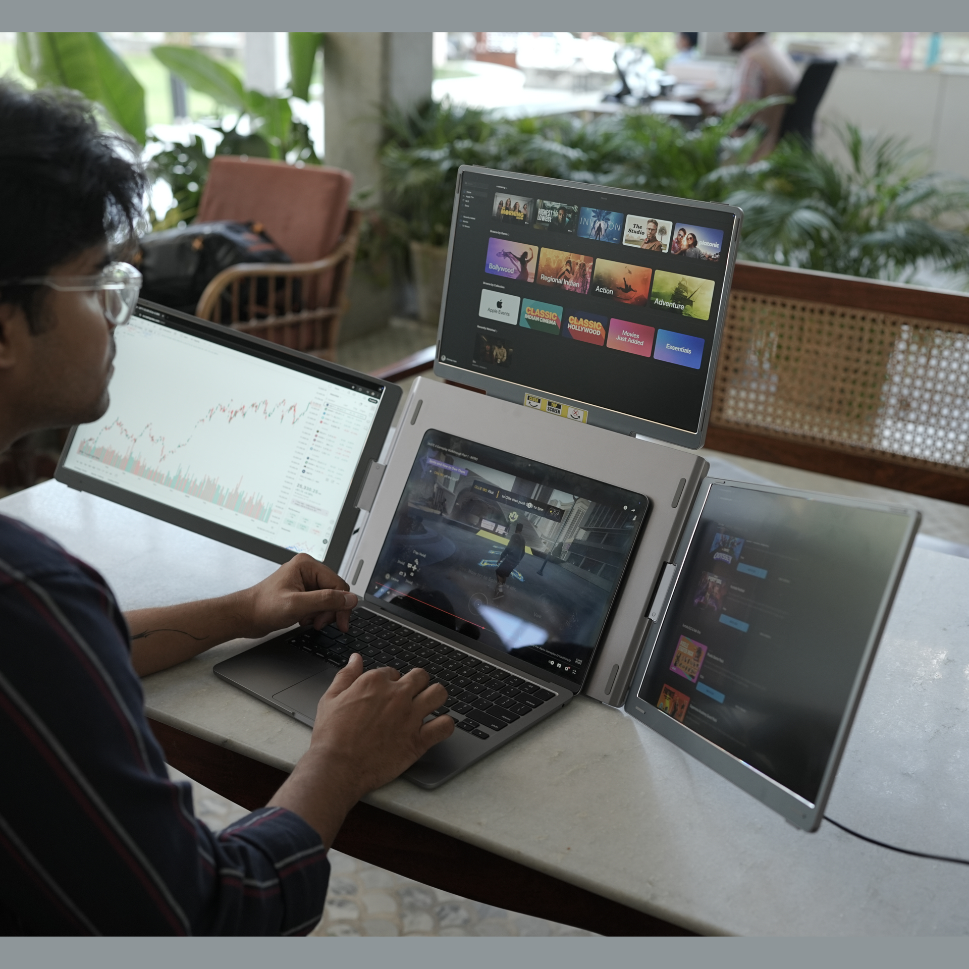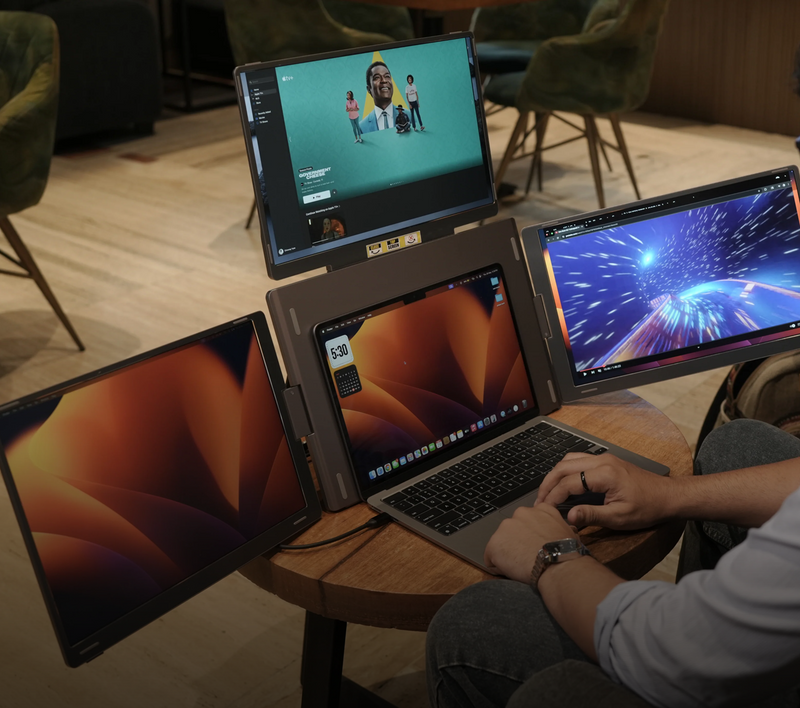 Each screen delivers Full HD resolution, ensuring crisp visuals for charts, code, video editing, and presentations. The foldable and portable design makes it easy to carry in a backpack, allowing you to set up a complete workstation anywhere—office, home, café, or while travelling.